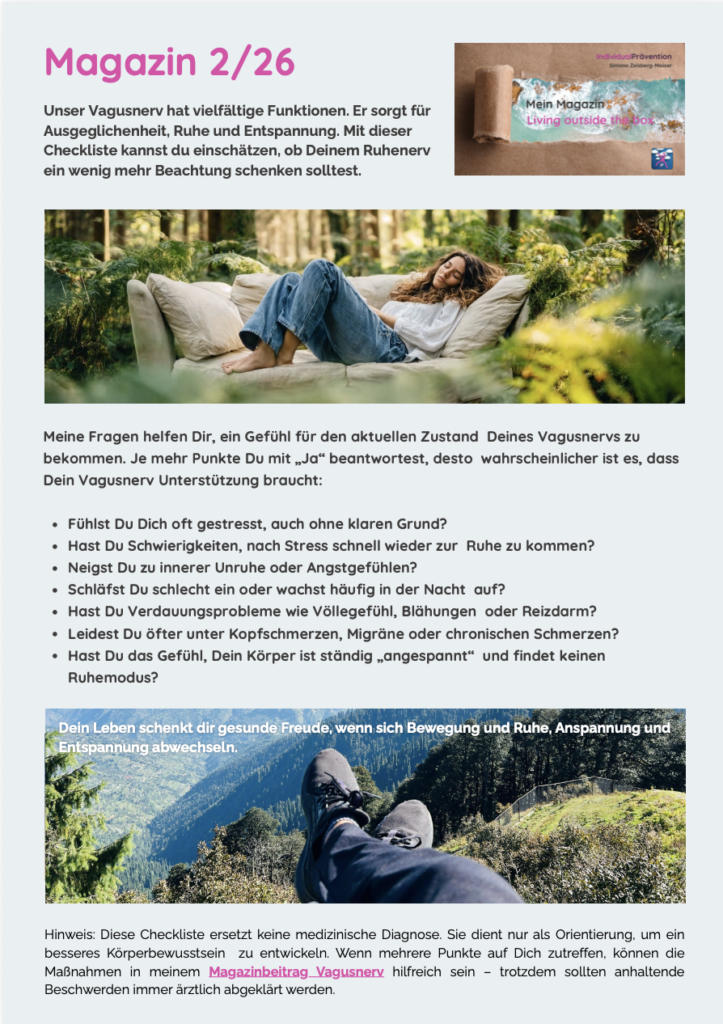 Wenn du zunächst erst einmal herausfinden möchtest, wie es um die Funktionalität deines Vagusnerv bestellt ist, dann ist mein Februar-Gimmick genau das Richtige für dich – hier ist auch nochmals der Beitrag mit dem “Vagometer” von Dr. Cordelia Schott verlinkt!